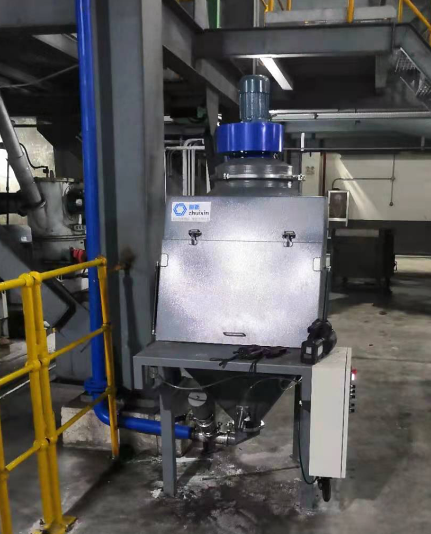 某環(huán)保行業(yè)客戶需要將小袋包裝的小蘇打加入到高塔料罐中,垂直距離20多米,最開始用鋼絲繩電動葫蘆,存在安全隱患,且投料會有粉塵,后考慮采用上海追新機械的氣力輸送方案。
