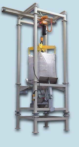 大袋開袋站是一個(gè)標(biāo)準(zhǔn)組件系統(tǒng),是由吊架、電動(dòng)葫蘆、起重導(dǎo)軌、支架、拍打裝置、夾袋裝置等組成;